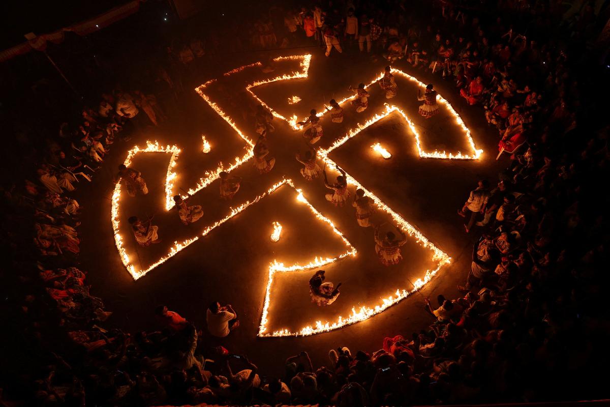 हिंदू भक्त 26 सितंबर, 2025 को जामनगर, गुजरात में नवरात्रि त्योहार समारोह के हिस्से के रूप में, स्वस्तिक ‘के गठन के अंदर गरबा करते हैं।
