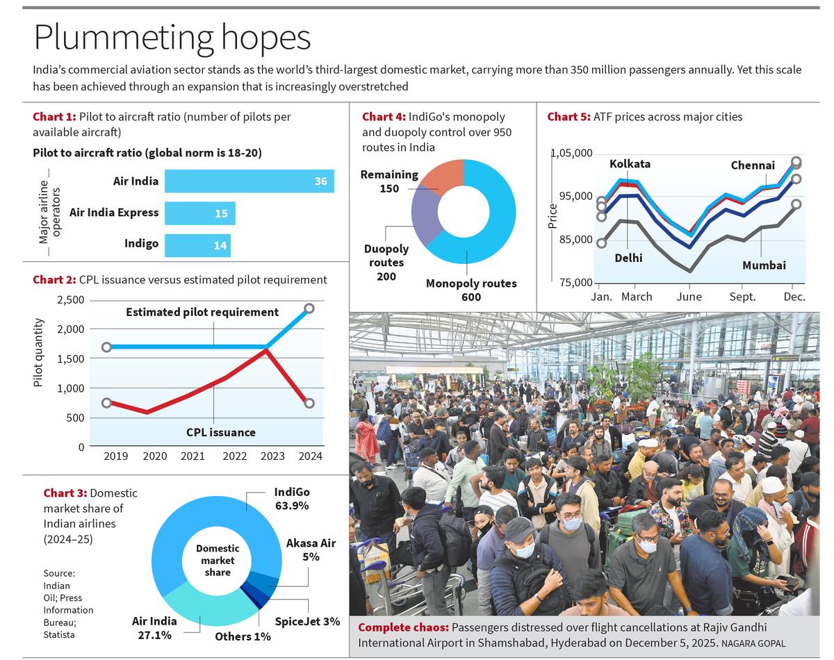 टीपिछला वर्ष भारत के नागरिक उड्डयन क्षेत्र में निरंतर उथल-पुथल से भरा रहा, जिसमें कई विफलताएँ हुईं, जिसका पैमाना और आवृत्ति एकाधिकार (इंडिगो और एयर इंडिया समूह) के लिए एक गंभीर तस्वीर पेश करती है, दोनों अब भारी घाटे के लिए तैयार हैं, हाल के आंकड़ों के अनुसार, मुनाफे में भारी गिरावट आई है। इस वर्ष में जून 2025 में अहमदाबाद दुर्घटना से लेकर बड़े पैमाने पर उड़ान रद्द होने और लंबे समय तक उड़ान में देरी के कारण न केवल फंसे हुए यात्रियों के बीच, बल्कि बड़े पैमाने पर विमानन बाजार में अशांति पैदा हुई।