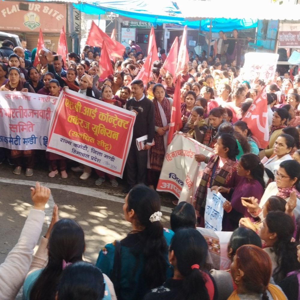 केंद्र सरकार द्वारा पिछले वर्ष लागू किए गए चार नए श्रम संहिताओं (लेबर कोड) के विरोध में मजदूर और किसान संगठनों ने राष्ट्रीय आह्वान पर देशव्यापी धरना प्रदर्शन किया। इसी कड़ी में हिमाचल प्रदेश के मंडी जिला मुख्यालय पर भी विरोध प्रदर्शन और रैली का आयोजन किया गया, जहां केंद्र सरकार के खिलाफ जमकर नारेबाजी की गई। हिमाचल प्रदेश मेडिकल रिप्रेजेंटेटिव यूनियन के अध्यक्ष प्रकाश ठाकुर और सीटू के जिला सचिव राजेश शर्मा ने इन श्रम संहिताओं को पूरी तरह से मजदूर विरोधी बताया। उन्होंने मांग की कि इन्हें तत्काल प्रभाव से वापस लिया जाना चाहिए।संगठनों की प्रमुख मांगों में मजदूरों के लिए 30,000 रुपये न्यूनतम वेतन निर्धारित करना शामिल है। कर्मचारियों को नियमित करने की मांग इसके अतिरिक्त, आंगनवाड़ी, मिड-डे मील और अन्य योजना कर्मियों को नियमित कर उन्हें सरकारी कर्मचारी के समान सुविधाएं प्रदान करने की भी मांग की गई। प्रदर्शनकारियों ने सरकार को चेतावनी दी है कि यदि उनकी मांगों को नहीं माना गया, तो आने वाले समय में अनिश्चितकालीन हड़ताल की जाएगी। इस विरोध प्रदर्शन में कई अस्थायी कर्मियों ने भी अपनी उपस्थिति दर्ज कराई और सरकार से अपनी मांगें रखीं। इनमें ग्रेच्युटी लागू करना, मनरेगा को बहाल करना, सार्वजनिक क्षेत्र का विनिवेश बंद करना, तथा सार्वजनिक सेवाओं के व्यापारीकरण और निजीकरण पर रोक लगाना शामिल था। अन्य मांगों में आउटसोर्स, ठेका, कैजुअल, सेवा मित्र और मल्टी-टास्क मजदूरों के लिए नियमित रोजगार नीति बनाना, मजदूरों की 12 घंटे की ड्यूटी, फिक्स टर्म रोजगार और महिलाओं को रात्रि शिफ्ट ड्यूटी के आदेश वापस लेना शामिल था। मजदूर और किसान संगठनों ने स्मार्ट मीटर योजना वापस लेने और बिजली के निजीकरण को बंद करने की भी मांग की। साथ ही, 102 और 108 कर्मियों को नियमित करने तथा स्ट्रीट वेंडर एक्ट को लागू करने की भी अपील की गई। विरोध प्रदर्शन की अलग-अलग PHOTOS