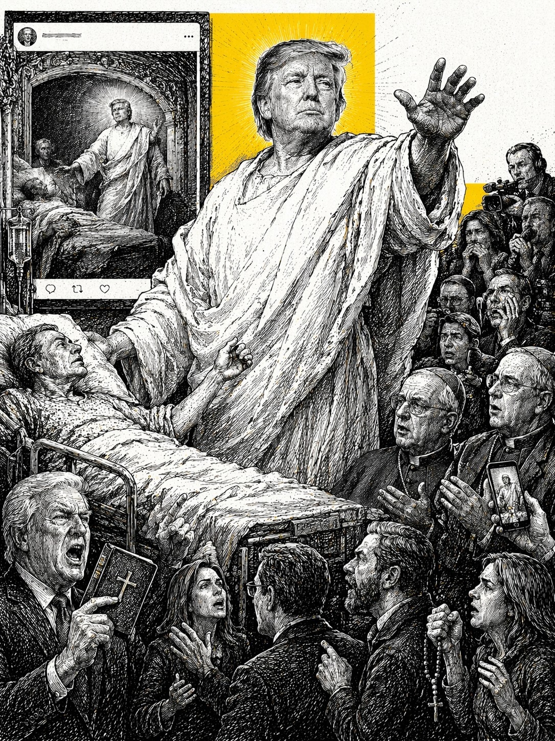 सोशल' पर एक पोस्ट आई: 'प्रेज बी टू अल्लाह'—अलहम्दुलिल्लाह।विश्लेषणवो शब्द, जो मुसलमान हर खुशी के मौके पर कहते हैं, मगर ट्रंप के मुंह से निकलते ही दुनिया ठहर गई।अगला मोड़अमेरिका के पहले अमेरिकी मूल के पोप, लियो चौदहवाँ, जिन्होंने ट्रंप की ईरान पर धमकियों को 'अस्वीकार्य' बताया था, अब उनके सामने खड़े थे।प्रभावट्रंप ने जवाब दिया—'पोप कमजोर है, अपराधों पर सख्त नहीं है, विदेश नीति में बेकार है।' मगर इस बार, उनके शब्दों ने ईसाइयों को भी बाँट दिया।आगे की परतघरों में बहसें होने लगीं, परिवार टूटने लगे।विश्लेषणफिर आया वो पोस्ट, जिसे ट्रंप ने 'डॉक्टर' बताया—एक AI-जेनरेटेड तस्वीर, जिसमें वो एक अस्पताल के बिस्तर पर खड़े थे, हाथअगला मोड़उठाए, जैसे कोई चमत्कार कर रहा हो।आगे की परतमगर सोशल मीडिया ने उसे 'यीशु' बना दिया।प्रभावट्रंप ने इसे हटा दिया, मगर देर हो चुकी थी। ईरान के सर्वोच्च नेता खामेनेई के आधिकारिक खाते ने जवाब दिया: 'हम मसीह के सम्मान की रक्षा करेंगे।' पोप ने शांतआगे की परतरहने का फैसला किया, मगर उनके सलाहकारों के दिलों में खौफ था।आगे की परतउन्होंने याद दिलाया कि चर्च ने हमेशा तलवार उठाई है—क्रूसेड से लेकर लेपांतो तक।