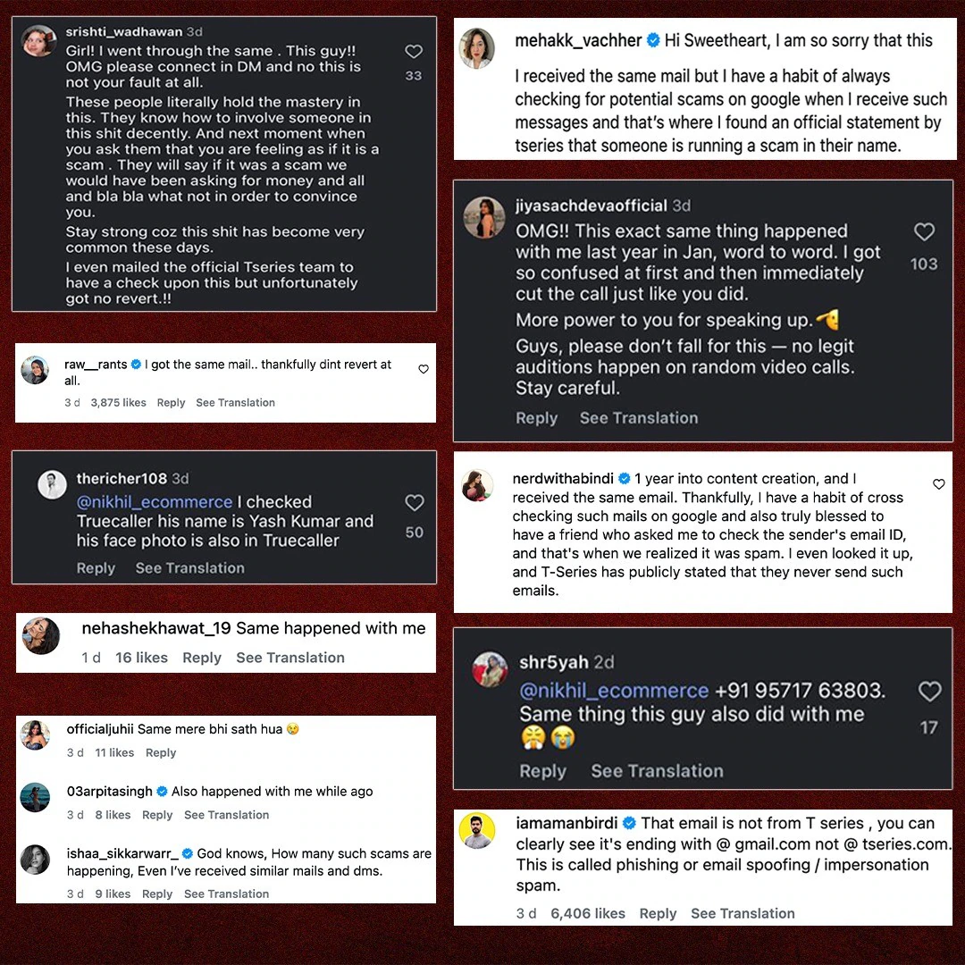 टी-सीरीज ने भी इस पर अपनी प्रतिक्रिया दी— उन्होंने कहा कि वो किसी भी ‘जीमेल आईडी’ या ‘अन-ऑफिशियल’ आईडी से लोगों से संपर्क नहीं करते। मगर सवाल ये है— अगर टी-सीरीज के नाम पर ऐसा हो रहा है, तो क्या ये सिर्फ एक ‘फर्जी कास्टिंग’ का मामला है? या फिर इसके पीछे कोई बड़ा ‘Conspiracy’ छिपा है? क्योंकि यश कुमार सिर्फ एक शख्स नहीं है— वो एक ‘Pattern’ है। वो सिर्फ कास्टिंग ही नहीं, बल्कि फॉलोवर्स बढ़ाने के नाम पर भी लोगों को फंसाता रहा है। और अब सवाल उठता है— क्या ये खेल अभी और कितने लोगों को निशाना बनाएगा?