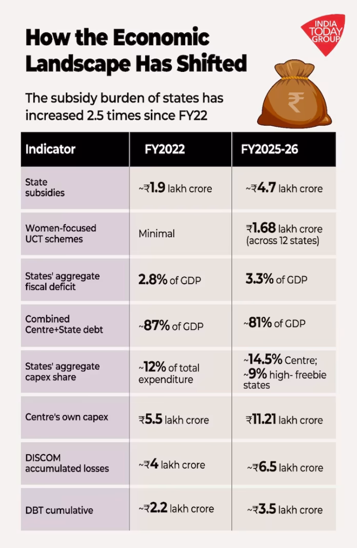अरे भाई, सोचो तो! सरकार जनता को मुफ्त में कुछ दे रही है, विपक्ष बोल रहा है ‘रेवड़ी कल्चर’, सरकार कह रही है ‘कल्याणकारी योजना’… लेकिन असली सवाल ये है कि क्या ये फ्रीबी वाला खेल अब इतना बढ़ गया है कि देश की अर्थव्यवस्था ही दम तोड़ने लगी है? 2022 से लेकर अब तक, ‘फ्रीबी’ का पैमाना, रफ्तार और वित्तीय बोझ इतना बढ़ गया है कि अब इसके नतीजे सामने आने लगे हैं। 2026 के बजट में सिर्फ 12 राज्यों ने महिलाओं को बिना शर्त नकद हस्तांतरण के लिए 1.68 लाख करोड़ रुपये रखे हैं। ये तो सिर्फ एक छोटा सा हिस्सा है—राज्यों का कुल सब्सिडी बिल 2018-19 से दोगुना होकर 4.7 लाख करोड़ रुपये हो गया है। बिजली सब्सिडी, किसान कर्ज माफी, मुफ्त अनाज, मुफ्त परिवहन… सब मिलाकर देखो तो राज्य सरकारों का कर्ज दस साल में तीन गुना हो गया है। ब्याज का बोझ इतना बढ़ गया है कि कई राज्यों की राजस्व आय का पांचवा हिस्सा सिर्फ ब्याज चुकाने में चला जाता है। सड़कें, स्कूल, अस्पताल… सब पीछे छूट रहे हैं।