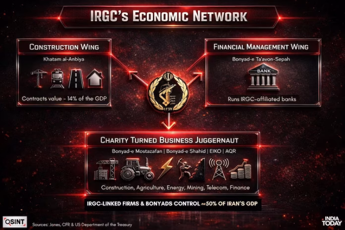क्लिंगेंडेल इंस्टीट्यूट की एक रिपोर्ट कहती है कि आईआरजीसी और इसके ‘सैन्य-बोनीड कॉम्प्लेक्स’ का ईरान की जीडीपी में 50% से ज्यादा का योगदान है। मतलब साफ है… अगर ईरान का अर्थतंत्र एक शरीर है, तो आईआरजीसी उसका दिल है। इसकी कमाई का एक बड़ा हिस्सा आता है ‘खतम अल-अंबिया’ नाम के संगठन से, जो युद्ध के बाद ईरान के पुनर्निर्माण का काम करता था। आज ये संगठन सिर्फ ईरान में ही नहीं, बल्कि अफ्रीका, यूरोप, दक्षिण एशिया और रूस तक में अरबों डॉलर के प्रोजेक्ट्स चला रहा है। इसकी कमाई का अनुमान है करीब 50 अरब डॉलर… जो ईरान की जीडीपी का 14% है! है ना चौंकाने वाली बात?