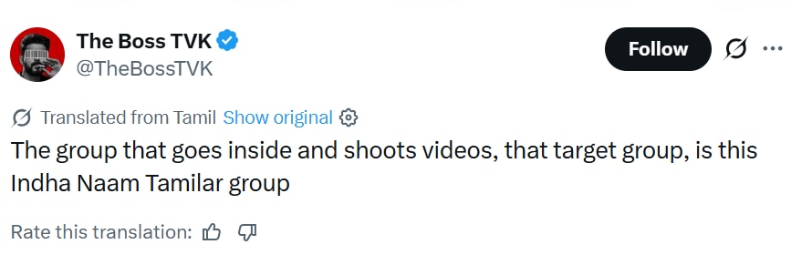 यूजर ने लिखा, ”जो ग्रुप अंदर जाता है और वीडियो शूट करता है, वह टारगेट ग्रुप, यह इंधा नाम तमिलर ग्रुप है।”