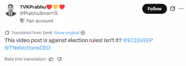 “यह वीडियो पोस्ट चुनाव नियमों के विरुद्ध है! है ना?” एक यूजर ने भारतीय चुनाव आयोग (ईसीआई) और तमिलनाडु के मुख्य चुनाव आयुक्त के आधिकारिक एक्स अकाउंट को टैग करते हुए लिखा।
