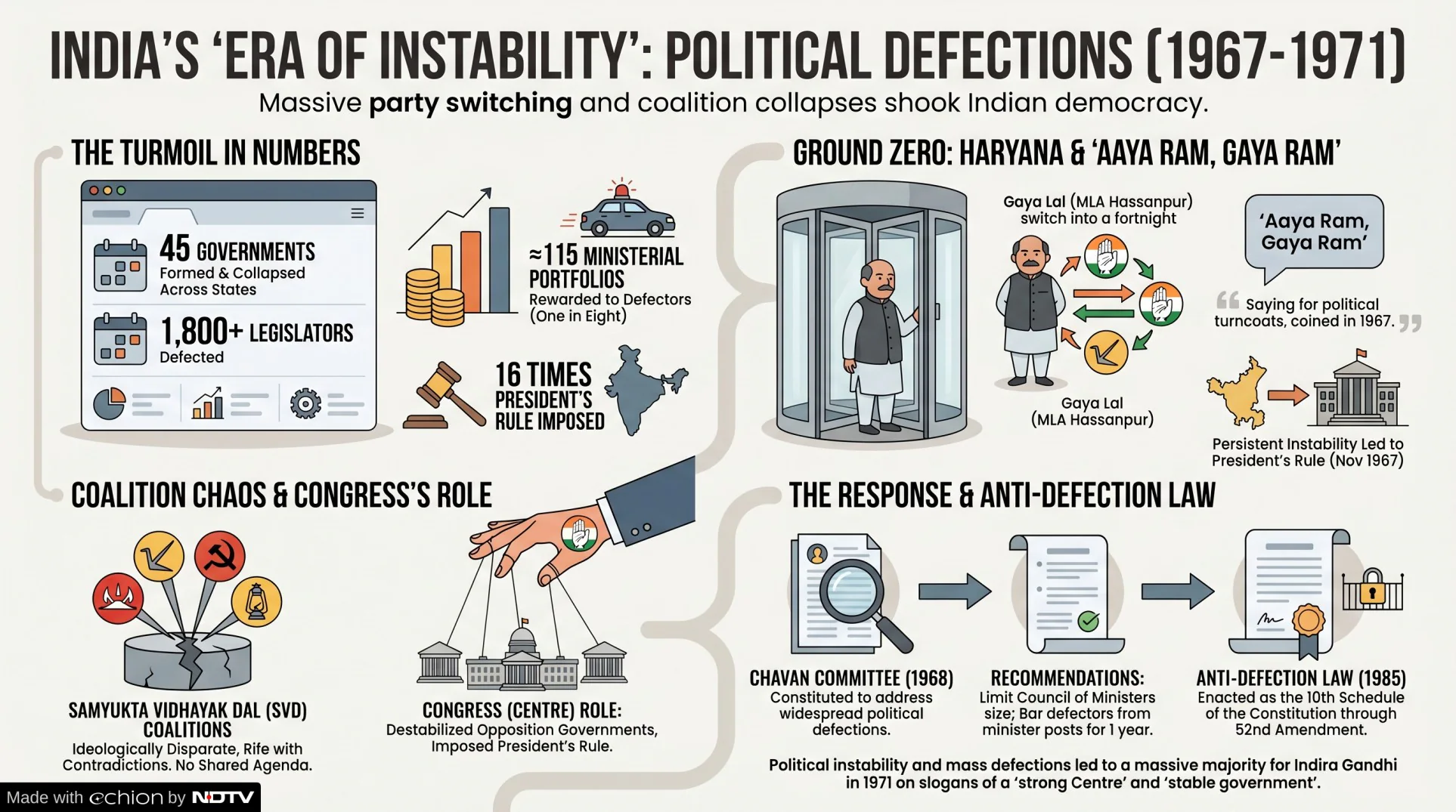 1967 के चुनावों के बाद देश में पहली बार इतने बड़े पैमाने पर सरकारें गिरने लगीं। कांग्रेस को आठ राज्यों में हार मिली—उत्तर प्रदेश, बिहार, पश्चिम बंगाल, ओडिशा, मद्रास (अब तमिलनाडु), केरल, राजस्थान, और पंजाब। इन राज्यों में गैर-कांग्रेस सरकारें बनीं, लेकिन वो सरकारें ज़्यादा देर तक नहीं टिक सकीं। क्योंकि विधायक एक पार्टी से दूसरी पार्टी में जाने लगे। वो दौर था जब Haryana के Gaya Lal ने सिर्फ 15 दिनों में तीन बार पार्टी बदली थी। वो दौर था जब ‘Aaya Ram Gaya Ram’ जैसे मुहावरे ने राजनीति में एक नया अर्थ ले लिया था।