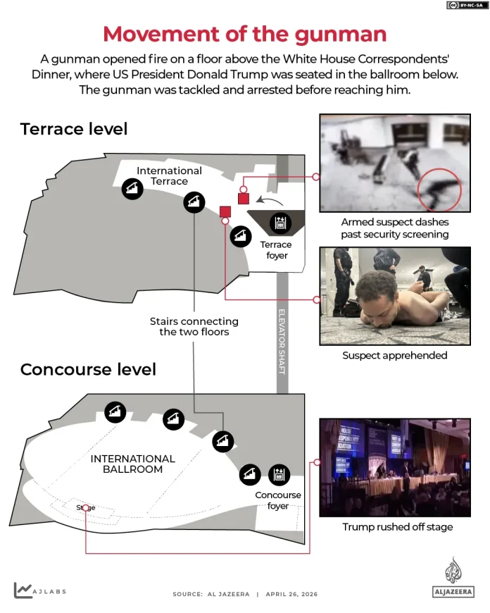 वाशिंगटन हिल्टन होटल में चल रहा था व्हाइट हाउस कॉरेस्पोंडेंट्स डिनर। वहां ट्रंप, उनकी पत्नी मेलानिया, उपराष्ट्रपति जेडी वांस और कैबिनेट के सदस्य मौजूद थे। सब शांतिपूर्वक बैठे थे, तभी अचानक गोली की आवाज़ गूंजी। सीक्रेट सर्विस के एजेंट ने तुरंत ट्रंप को उठाया और उन्हें सुरक्षित स्थान पर ले गए। गोली एक एजेंट को लगी, लेकिन उसकी बुलेटप्रूफ जैकेट ने उसकी जान बचा ली।