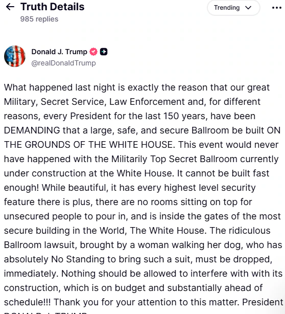ट्रम्प ने आगे कहा, ‘हमारी महान सेना, गुप्त सेवा, कानून प्रवर्तन—हर कोई पिछले 150 सालों से यही मांग कर रहा है। लेकिन अफसोस, एक महिला का मुकदमा आड़े आ गया।’ उन्होंने एक ऐसे मुकदमे का जिक्र किया, जिसमें एक महिला ने व्हाइट हाउस में एक बॉलरूम बनाने के खिलाफ मुकदमा दायर किया था। ट्रम्प ने कहा, ‘उसके पास ऐसा सूट लाने की क्षमता नहीं है, और इसे तुरंत हटा दिया जाना चाहिए।’