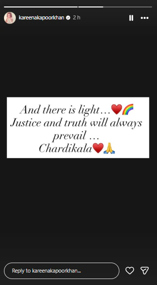 फैसले के तुरंत बाद, करीना ने इंस्टाग्राम स्टोरीज़ पर एक संदेश साझा किया जिसमें लिखा था, “और प्रकाश है (लाल दिल और इंद्रधनुष इमोटिकॉन)। न्याय और सच्चाई हमेशा जीतेगी। चारदीकला (हाथ जोड़कर इमोटिकॉन)।” उन्होंने पोस्ट में सीधे तौर पर मामले का जिक्र नहीं किया.