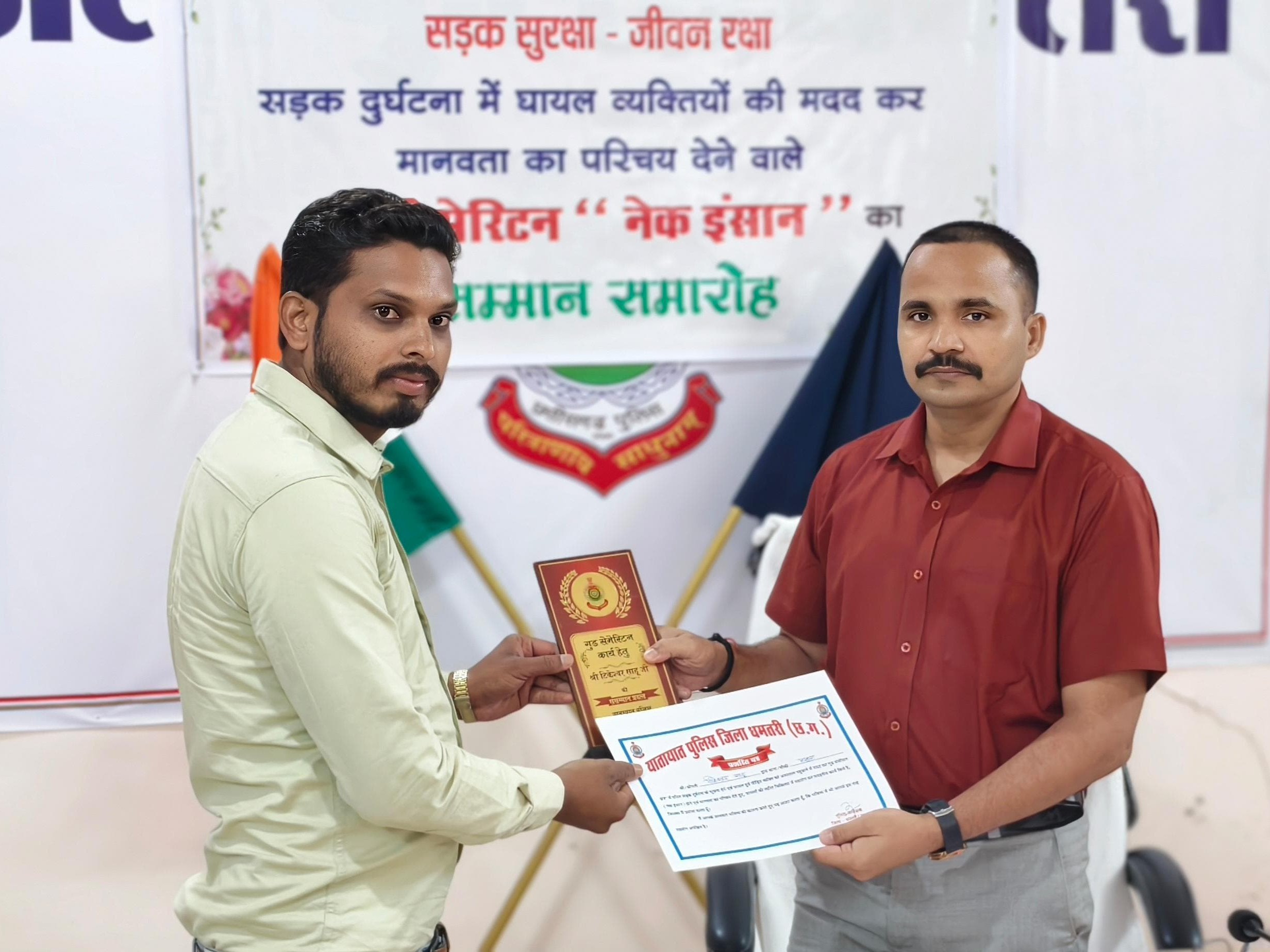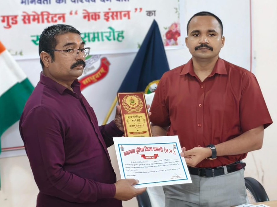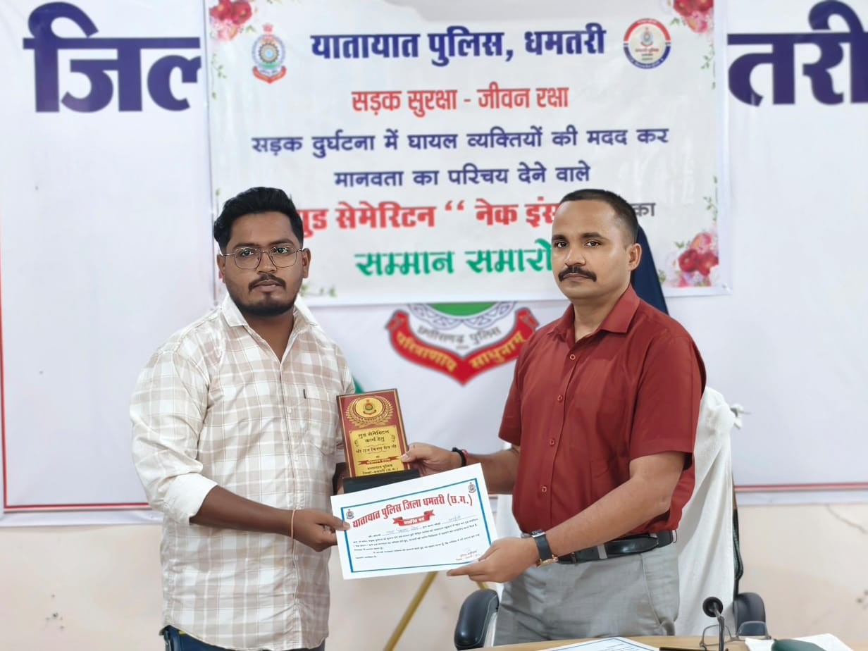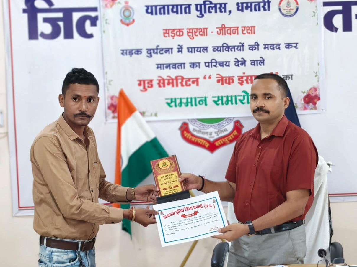 धमतरी पुलिस अधीक्षक कार्यालय में आयोजित समारोह में इन पांच नागरिकों को सम्मानित किया गया। इन्होंने न केवल दुर्घटनास्थल पर घायलों की मदद की, बल्कि हाईवे पेट्रोलिंग और एम्बुलेंस को समय पर सूचित कर घायलों को अस्पताल पहुंचाने में महत्वपूर्ण भूमिका निभाई।