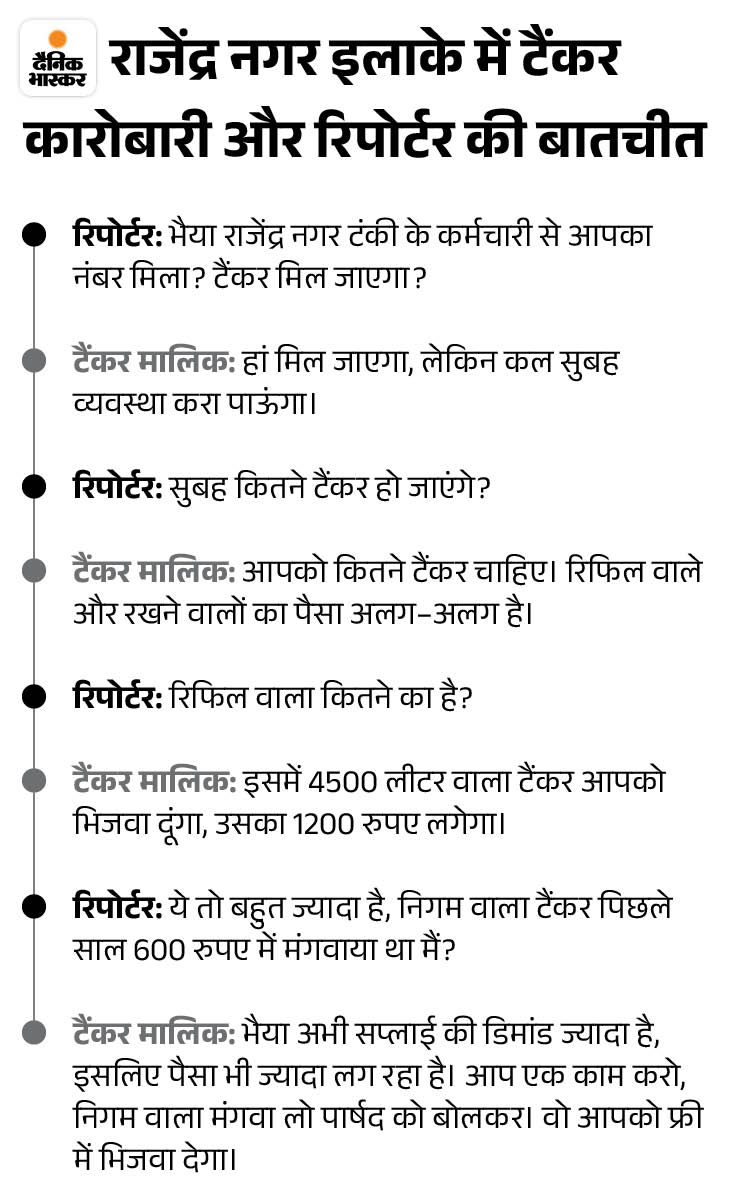 टैंकर माफिया कर्मचारियों से सांठ–गांठ कर नगर निगम के बोर से 200 से 500 का पानी खरीद रहे हैं। इसे आम जनता को 1400 से 2000 में बेच रहे हैं। बड़ी हाईप्रोफाइल कॉलोनियों में इन टैंकरों की कीमत 3 हजार तक लगाई जाती है।