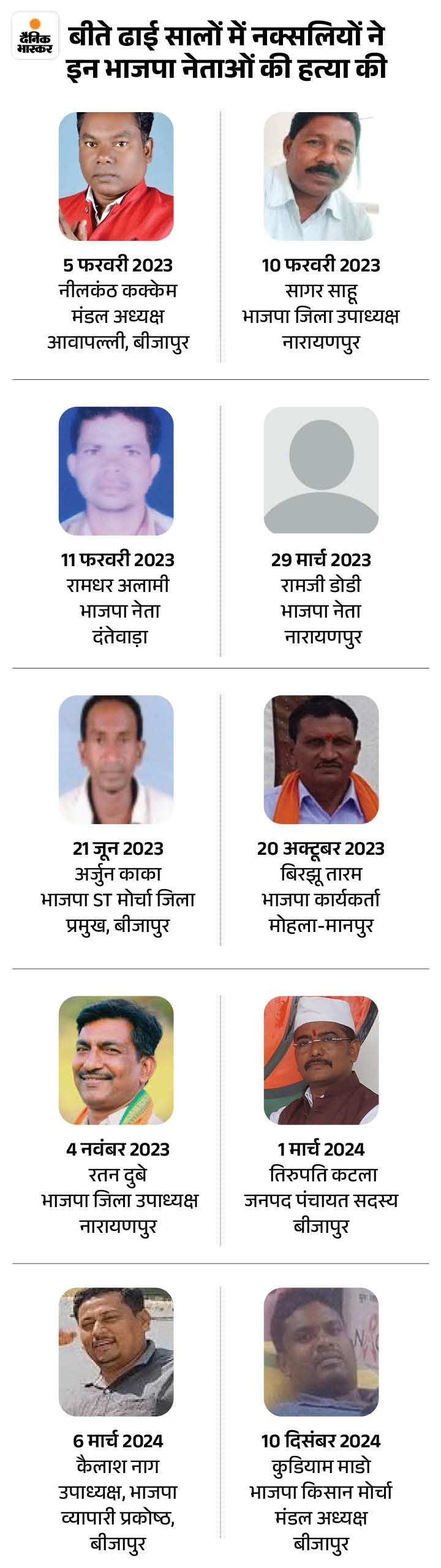 बीते दो सालों में नक्सलियों ने भाजपा के 10 नेताओं की हत्या की है। सबसे ज्यादा मामले बीजापुर जिले के हैं। अकेले यहां 5 नेताओं को नक्सलियों ने मार दिया। बाकी हत्याएं दंतेवाड़ा, मोहला-मानपुर और नारायणपुर में हुईं।