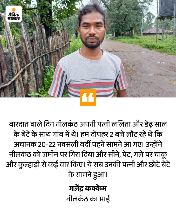 गजेन्द्र की आंखें भर आईं। उन्होंने बताया कि उस दिन के बाद से भाभी ललिता ने गांव छोड़ दिया। वह बच्चों के साथ अब आवापल्ली में रहती हैं। इतना ही नहीं, नक्सलियों के डर से नीलकंठ की तस्वीर भी घर से हटा दी गई। गजेन्द्र कहते हैं -“भाई की याद में फोटो तक रखने की हिम्मत नहीं होती। जब देखने का मन करता है तो आवापल्ली जाकर तस्वीर देखता हूं।”