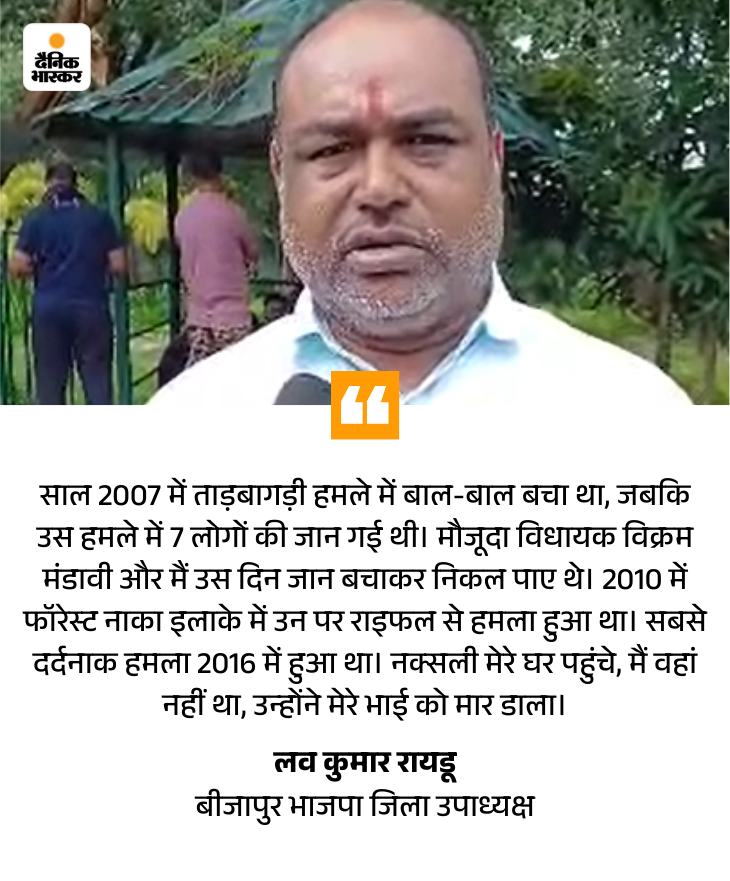 बीजापुर भाजपा जिला उपाध्यक्ष लव कुमार रायडू हमेशा जवानों के सुरक्षा घेरे में रहते हैं।