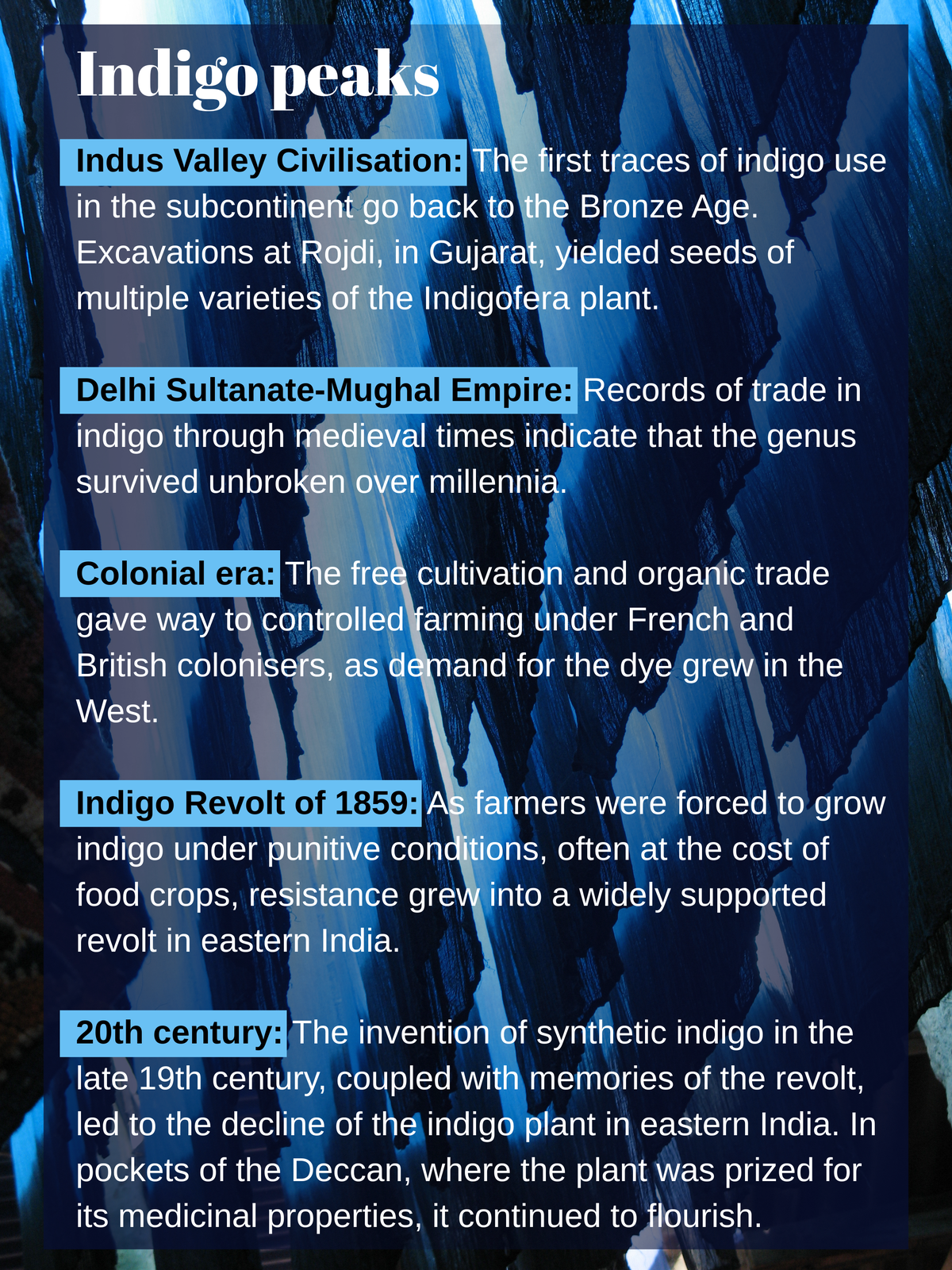 The care could be a metaphor for indigo in the Indian culturescape right now. From the west to the east and the south to the north, this ancient dye — predominantly used for fabric in most of recorded history — is the focus of new cultivation, fresh innovations and novel applications. Indigo-dyed stone? Done. Indigo-infused metal? Patented. Indigo you can wear as a perfume? So close.