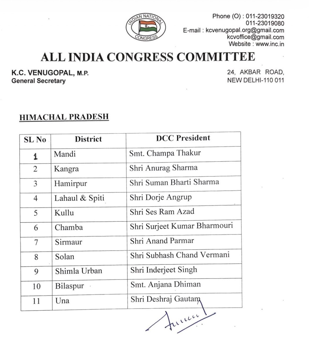अखिल भारतीय कांग्रेस कमेटी (AICC) ने देर रात हिमाचल के 11 जिलों में अध्यक्षों की नियुक्ति कर दी है। ये नियुक्तियां संगठन सृजन अभियान के तहत की गई है। इन्हें तत्काल प्रभाव से लागू माना जाएगा। इनकी नियुक्ति से पहले पार्टी ने सभी जिलों में ऑब्जर्वर भेजे