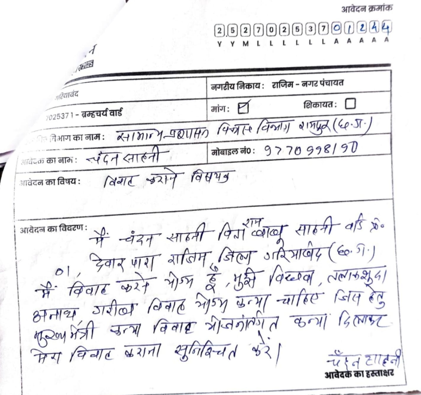 संतोष साहू ने लिखा कि, मेरी बेटी थनेश्वरी साहू विवाह के योग्य हो चुकी है। लेकिन मेरी आर्थिक स्थिति ठीक नहीं होने के कारण शादी कराने में परेशानी आ रही है। महोदय जी निवेदन है कि मेरी बेटी की शादी के लिए कन्या विवाह योजना के तहत आर्थिक सहायता प्रदान करें।