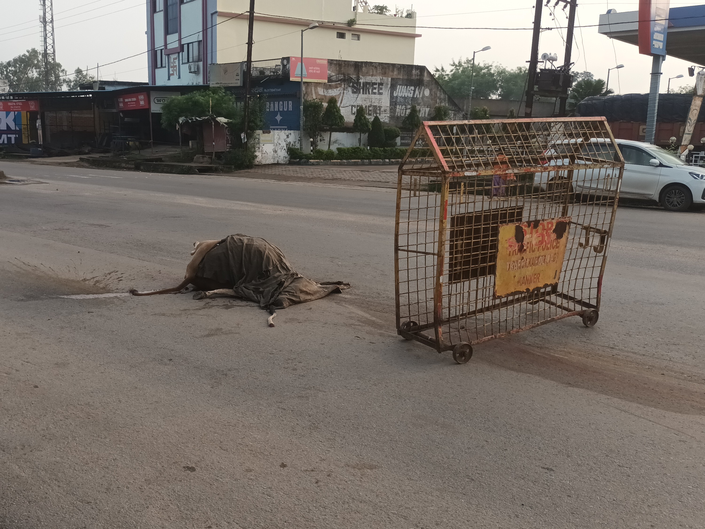 कांकेर जिले के चारामा नगर पंचायत में NH 30 पर मवेशियों के दुर्घटनाग्रस्त होने की घटनाएं लगातार सामने आ रही हैं। मंगलवार (16 सितंबर) रात भी एक भारी वाहन की चपेट में आने से दो मवेशी गंभीर रूप से घायल हो गए, जिनमें से एक की मौके पर ही मौत हो गई।