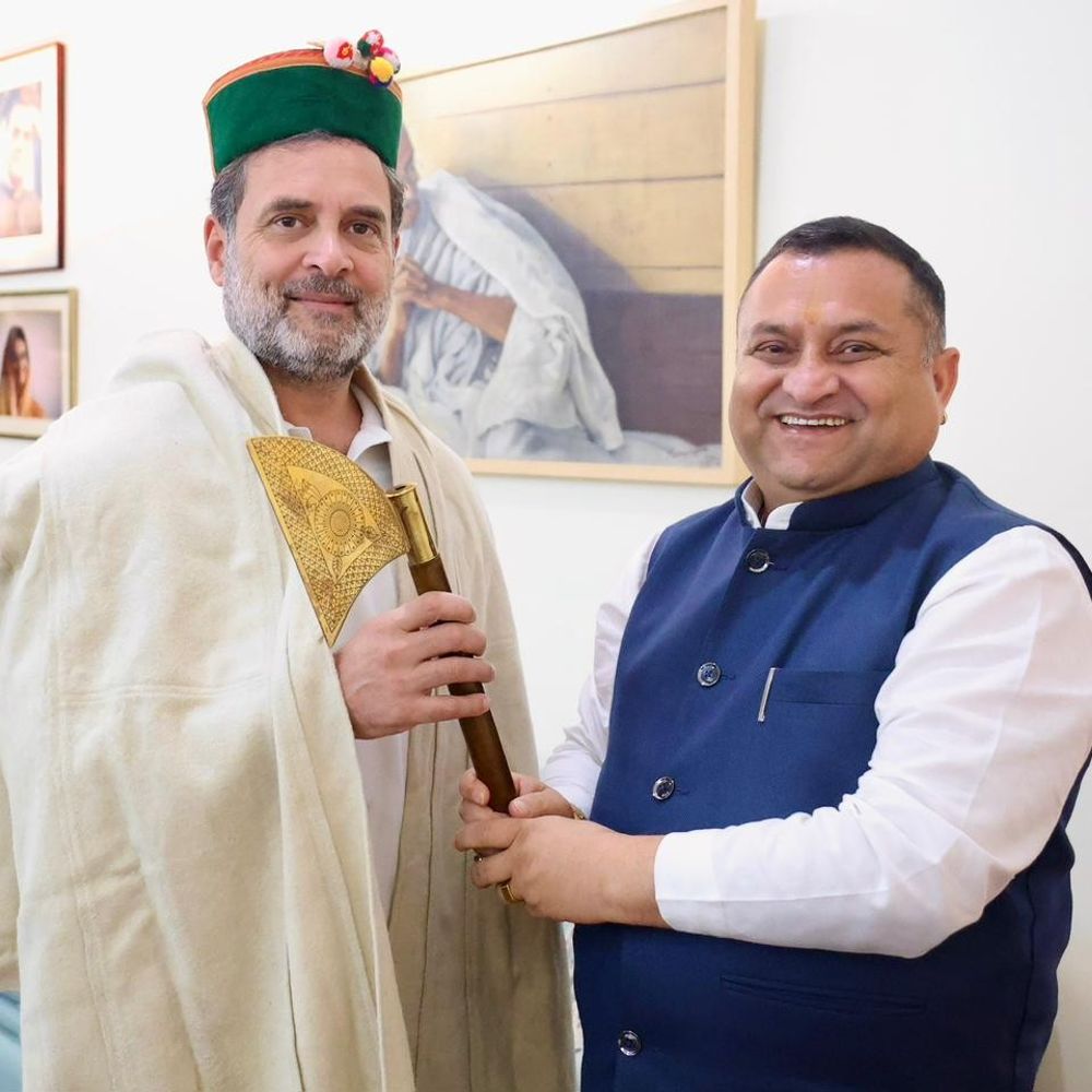 हिमाचल कांग्रेस के नवनियुक्त अध्यक्ष विनय कुमार ने राहुल गांधी को पारंपरिक पोशाक लोइया, टोपी और डांगरू भेंट किया।