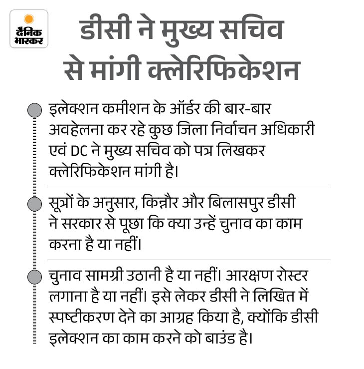 डीसी ने अब तक आरक्षण रोस्टर भी नहीं लगाया गया, जबकि पंचायतीराज विभाग के सेक्रेटरी ने 25 सितंबर तक इसे लगाने के आदेश दे रखे थे। आरक्षण रोस्टर के बगैर चुनाव करा पाना संभव नहीं है।