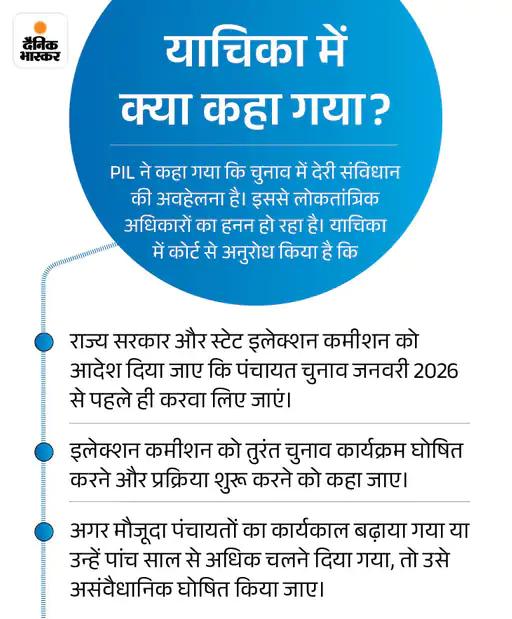 याचिका में कहा गया कि हिमाचल में पिछली पंचायत चुनाव प्रक्रिया दिसंबर 2020 से जनवरी 2021 के बीच तीन चरणों में हुई थी। संविधान के अनुच्छेद 243-ई के मुताबिक हर पंचायत का कार्यकाल 5 साल से ज्यादा नहीं हो सकता और मौजूदा जन प्रतिनिधियों का कार्यकाल खत्म होने से पहले ही चुनाव करवाना जरूरी है। मगर अब तक इलेक्शन कमीशन ने चुनाव का कार्यक्रम जारी नहीं किया और न ही तैयारी की है।