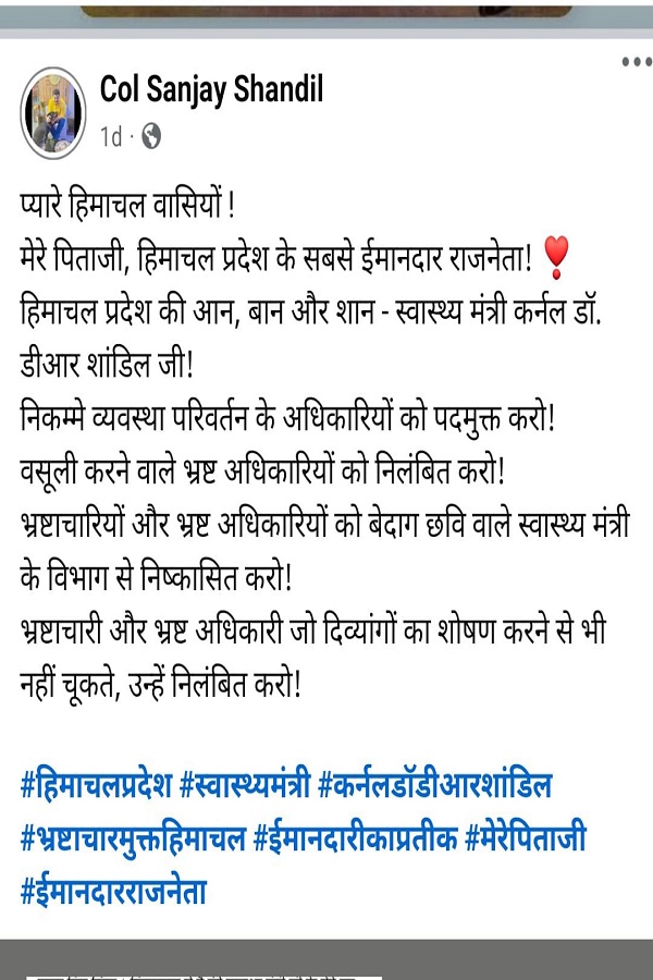 संजय शांडिल ने आगे लिखा- भ्रष्ट अधिकारी जो दिव्यांगों का शोषण करने से भी नहीं चूकते, उन्हें निलंबित किया जाए। उन्होंने लिखा- उनके पिता धनीराम शांडिल हिमाचल के सबसे ईमानदार राजनेता है। वह हिमाचल की आन-बान और शान है।