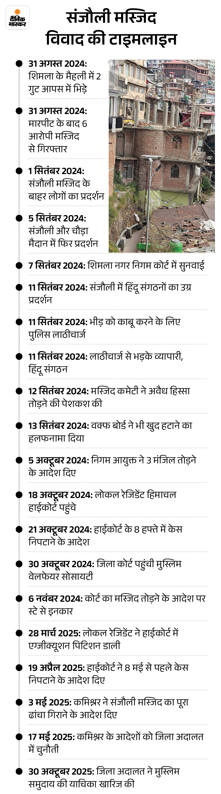 - 3 मई 2025 को निगम आयुक्त ने पूरी मस्जिद को अवैध करार देते हुए पूरा ढांचा तोड़ने के आदेश दिए। 17 मई 2025 को वक्फ बोर्ड और संजौली मस्जिद कमेटी ने मस्जिद तोड़ने के नगर निगम आयुक्त के आदेशों को जिला अदालत में चुनौती दी। 30 अक्टूबर को जिला अदालत ने वक्फ बोर्ड और संजौली मस्जिद कमेटी की याचिका को खारिज किया और नगर निगम आयुक्त के आदेशों को सही ठहराया।