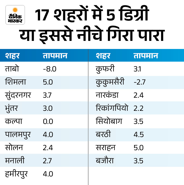 शिमला में भी रात का पारा 4 डिग्री सेल्सियस की गिरावट के बाद 5 डिग्री सेल्सियस रह गया है। वहीं मंडी के सुंदरनगर का न्यूनतम तापमान 3.7 डिग्री, कुल्लू के भुंतर का 3.0 डिग्री, कांगड़ा के पालमपुर का 4.0, सोलन का 2.4, मनाली का 2.7, हमीरपुर का 4.0 और कुल्लू के बजौरा का न्यूनतम तापमान 3.5 डिग्री तक गिर गया है।