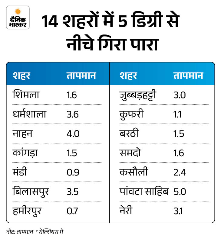 पालमपुर के तापमान में सामान्य की तुलना में सबसे ज्यादा 5.6 डिग्री की गिरावट आने के बाद तापमान माइनस -0.5 डिग्री तक गिर गया है।हमीरपुर का तापमान नॉर्मल से 4.1 डिग्री नीचे गिरने के बाद 0.7 डिग्री, मंडी का पारा 3.4 डिग्री गिरने के बाद 0.9 डिग्री सेल्सियस रह गया है। अन्य शहरों के तापमान में भी बड़ी गिरावट आई है। पहाड़ों पर इससे सुबह-शाम व रात में जोरदार ठंड पड़ रही है।