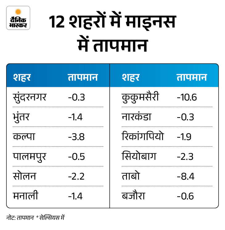 इससे ठंड में और इजाफा होगा। प्रदेश में कोहरे और शीतलहर के कारण कड़ाके की सर्दी पड़ रही है। राज्य के 12 शहरों में तापमान माइनस में चला गया है, जबकि 14 जगह 5 डिग्री सेल्सियस से नीचे गिर चुका है। लाहौल स्पीति के कुकुमसैरी में पारा -10.6 डिग्री, ताबो का 8.4 डिग्री, कल्पा -3.8, मनाली -1.4 डिग्री और सोलन में भी -2.2 डिग्री तक लुढ़क चुका है।