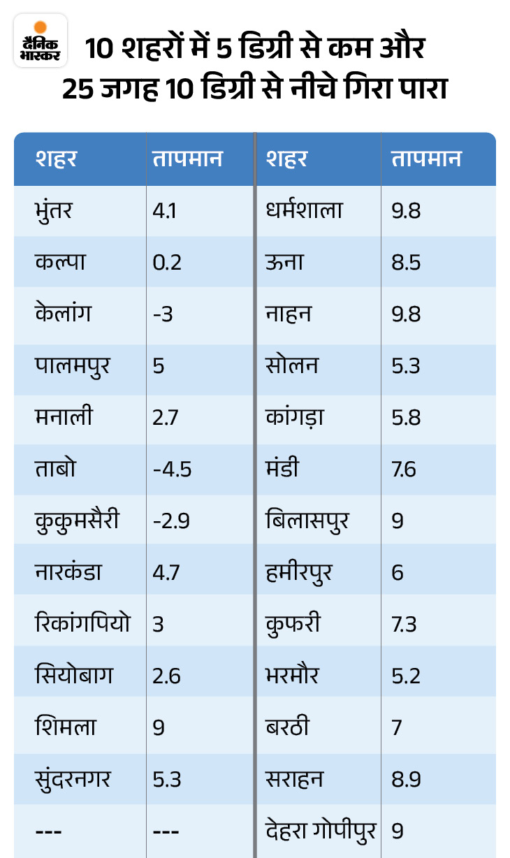 वहीं अधिक ऊंचे क्षेत्रों में भी ठंड में इजाफा हो रहा है। ताबो का न्यूनतम तापमान सबसे कम माइनस (-4.5) डिग्री, कुकुमसैरी का माइनस (-2.9) और केलांग का माइनस (-3) डिग्री रह गया है। प्रदेश के 25 शहरों का तापमान 10 डिग्री से नीचे और 10 शहरों में 5 डिग्री से कम हो गया है।