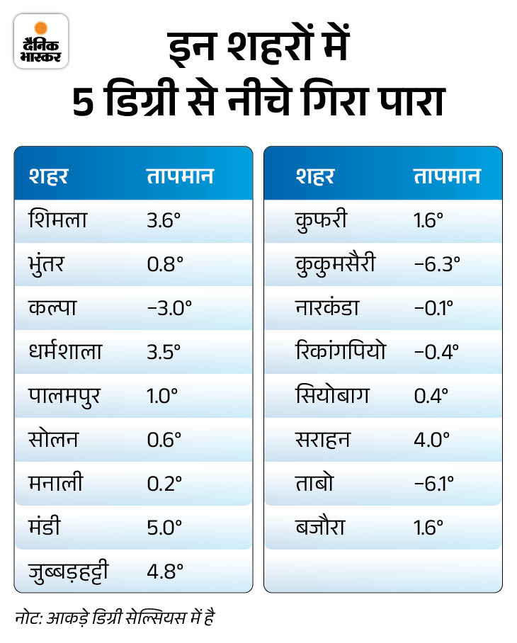किन्नौर के कल्पा में माइनस 3 डिग्री, कुकुमसैरी में माइनस 6.3 डिग्री, ताबो में माइनस 6.1 डिग्री, रिकांगपियो में माइनस -0.4 डिग्री और नारकंडा में माइनस -0.1 डिग्री तक गिर गया है। कुल्लू के भुंतर में 0.8, पालमपुर में 1.0, सोलन 0.6, मनाली 0.2, सियोबाग 0.4 डिग्री तक गिर गया है।