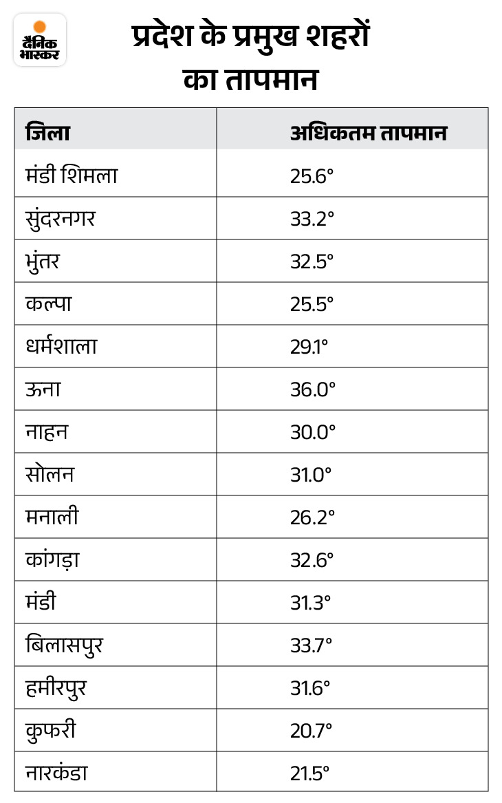वहीं, ऊना का अधिकतम तापमान सामान्य से 3.1 डिग्री के उछाल के साथ 36 डिग्री पहुंच गया है। प्रदेश के 26 शहरों में से 14 जगह का अधिकतम तापमान 30 डिग्री सेल्सियस पार कर चुका है। सोलन का तापमान 3.1 डिग्री के उछाल के साथ 31 डिग्री और शिमला का पारा सामान्य से 2.9 डिग्री के उछाल के साथ 25.6 डिग्री सेल्सियस हो गया है।