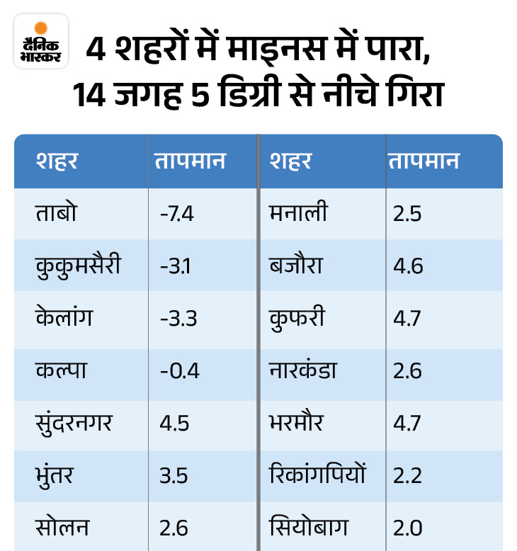 लाहौल स्पीति के ताबो का न्यूनतम तापमान माइनस -7.4 डिग्री, कुकुमसैरी का माइनस -3.1 डिग्री, केलांग का माइनस -3.3 और कल्पा का माइनस -0.4 तक गिर चुका है।