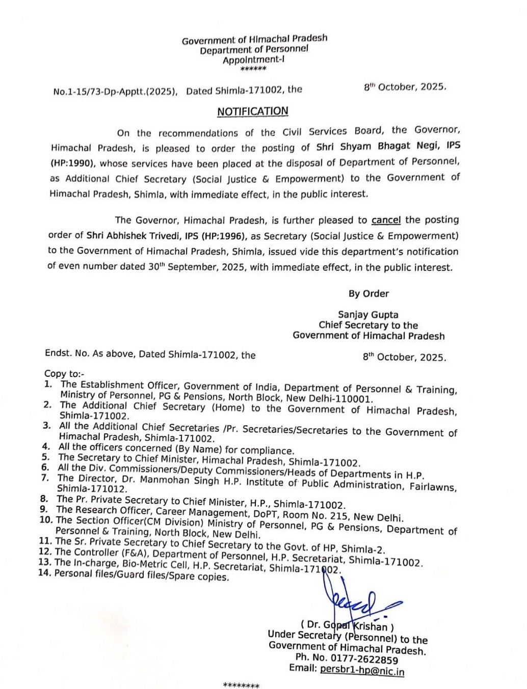 हिमाचल सरकार ने 1990 बैच के आईपीएस ऑफिसर श्याम भगत नेगी को एडिशनल चीफ सेक्रेटरी (एसीएस) सोशल जस्टिस एवं एंपावरमेंट डिपार्टमेंट का जिम्मा दे दिया है। श्याम भगत नेगी कुछ समय पहले ही केंद्रीय प्रतिनियुक्ति से दिल्ली से वापस लौटे हैं।