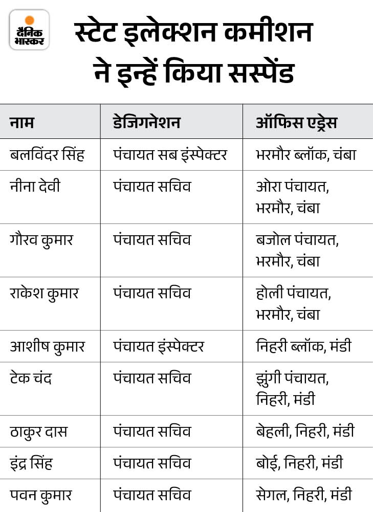 हिमाचल प्रदेश में वोटर लिस्ट का प्रारूप तैयार करने में लापरवाही बरतने वाले 9 अधिकारियों व कर्मचारियों को स्टेट इलेक्शन कमीशन ने सस्पेंड कर दिया है। इनमें एक पंचायत इंस्पेक्टर, एक पंचायत सब इंस्पेक्टर और 7 पंचायत सचिव शामिल हैं। सस्पेंशन के दौरान इनका