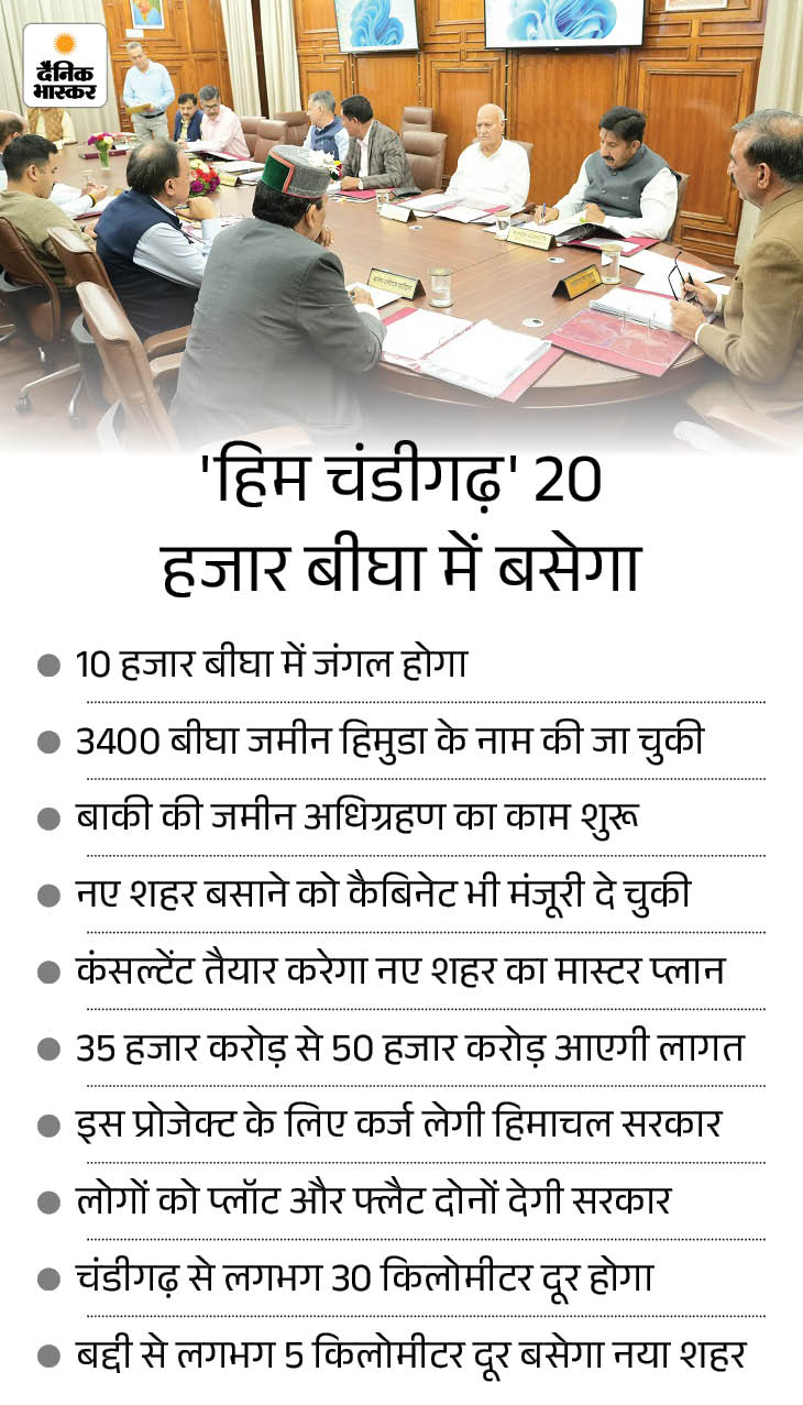 - 20 हजार बीघा में बसेगा, आधे हिस्से में सिर्फ जंगल: चंडीगढ़-बद्दी रोड पर सरकार इसे 20 हजार बीघा जमीन पर डेवलप करेगी। इसके 10 हजार बीघा में सिर्फ ग्रीनरी यानी जंगल होगा। CM सुखविंदर सुक्खू ने कहा कि जंगल को नहीं छेड़ेंगे। ‘हिम चंडीगढ़’ प्रोजेक्ट के लिए 3400 बीघा जमीन हाउसिंग डिपार्टमेंट के नाम की जा चुकी है। लैंड पुलिंग मॉडल में जमीन ली जा रही है। 2 महीने में जमीन एक्वायर करने की प्रक्रिया पूरी हो जाएगी।