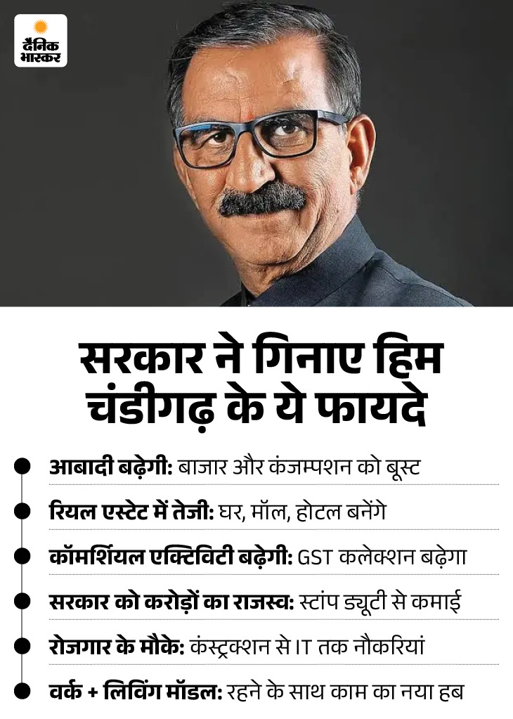 सरकार हिम चंडीगढ़ क्यों बना रही इस बारे में हिमाचल सरकार का तर्क है कि प्रदेश से सैकड़ों लोग और खासकर युवा चंडीगढ़ या उससे सटे पंचकूला और मोहाली में पलायन कर रहे हैं। इसकी बड़ी वजह नौकरी, पढ़ाई और कारोबार है। इसके अलावा यहां का हाई क्लास रहन-सहन भी लोगों को लुभाता है। इसलिए हिम चंडीगढ़ बनने से पलायन करने वाले वहां जाने के बजाय यहां रहना पसंद करेंगे। यहां लोगों को नौकरी के मौके भी मिलेंगे।