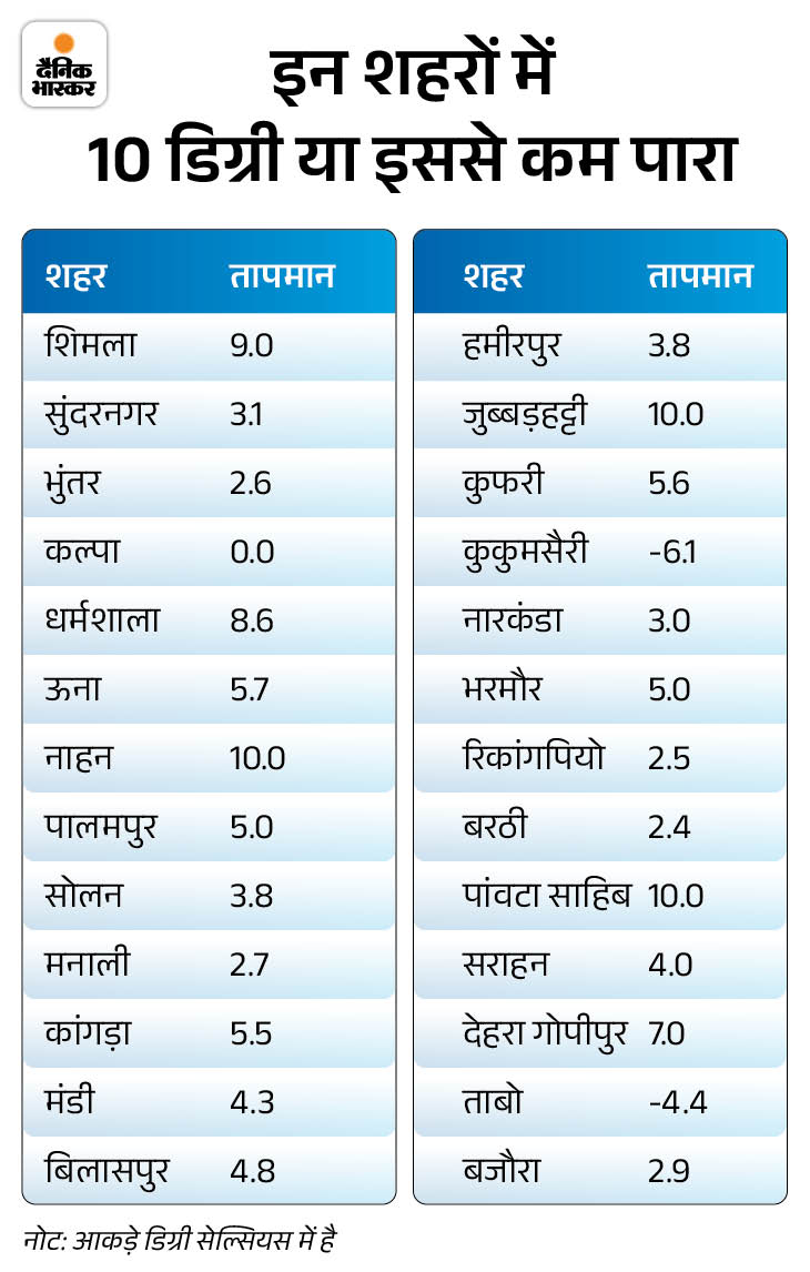 बारिश-बर्फबारी से पहले ही ऊंचे क्षेत्रों में शीतलहर और मैदानी इलाकों में कोहरा छाने से सुबह-शाम व रात को कड़ाके की सर्दी पड़ रही है। प्रदेश के 26 शहरों का रात का तापमान 10 डिग्री सेल्सियस से नीचे गिर चुका है। लाहौल स्पीति के कुकुमसैरी का पारा माइनस 6.1 डिग्री और ताबो का माइनस 4.4 डिग्री सेल्सियस रह गया है।