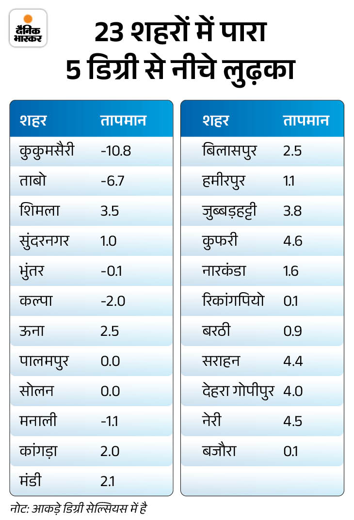 हिमाचल के 23 शहरों में न्यूनतम तापमान 5 डिग्री सेल्सियस या इससे भी नीचे गिर गया है। जनजातीय क्षेत्र कुकुमसैरी में पारा माइनस (-10.8) डिग्री तक गिर गया, जो प्रदेश में सबसे ठंडा स्थान रहा। ताबो में माइनस (-6.7), कल्पा माइनस (-2.0), मनाली माइनस (-1.1) और भुंतर माइनस (-0.1) डिग्री तक गिर गया है।