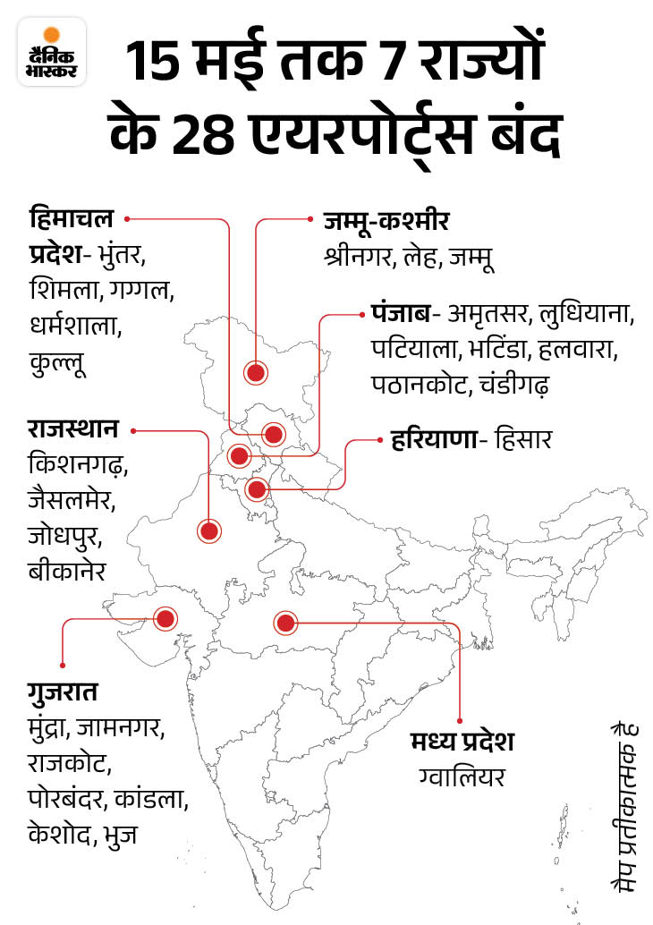 भारत-पाकिस्तान तनाव के बाद 7 राज्यों के 28 एयरपोर्ट्स को 15 मई तक बंद किया गया है। पहले ये 10 मई तक के लिए बंद किए गए थे। ये एयरपोर्ट्स जिन राज्यों में हैं उनमें- जम्मू-कश्मीर, हिमाचल प्रदेश, पंजाब, हरियाणा, राजस्थान, गुजरात, मध्य प्रदेश शामिल हैं।