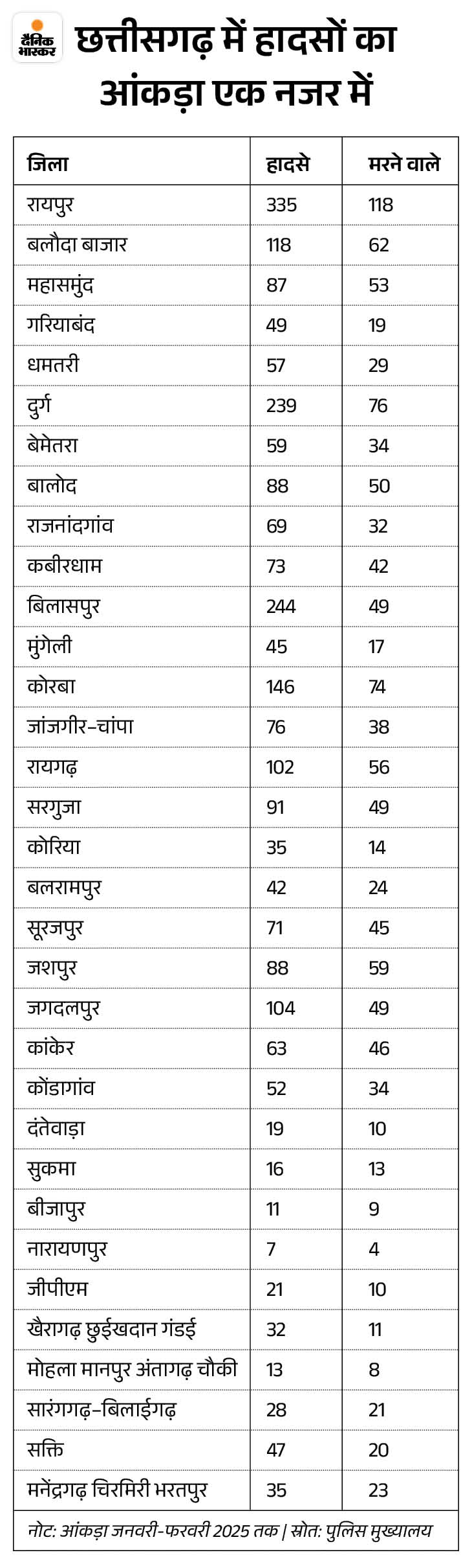 रायपुर जिले में लगातार हादसों का ग्राफ बढ़ रहा है। आंकड़ों की बात करें, तो जनवरी 2025 से लेकर अप्रैल 2025 तक जिले में जनवरी से लेकर अब तक 650 सड़क हादसे हुए हैं। इन हादसों में 221 लोगों की मौत हुई है। वहीं 436 लोग घायल हुए हैं।
