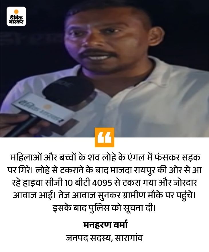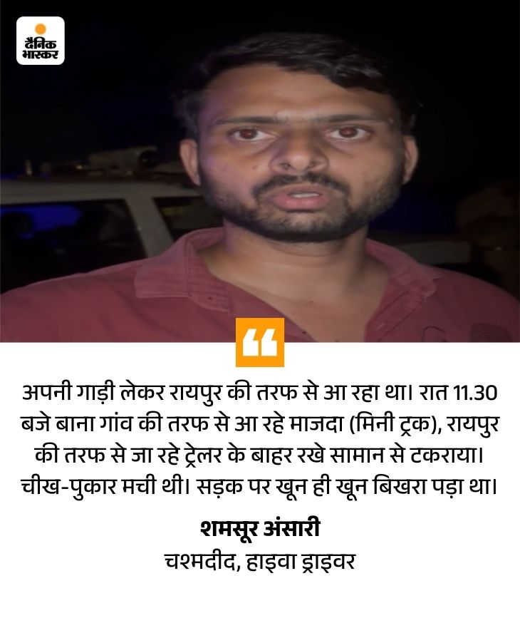 “रात करीब 11.30 बजे रात हाईवा लेकर पीछे-पीछे जा रहा था, तभी ट्रेलर और माजदा की टक्कर हुई। माजदा (मिनी ट्रक) में महिलाएं सवार थी। माजदा पहले लहराया, फिर ट्रेलर के डीजल टैंक और लोहे के एंगल से टकरा गया। टक्कर की आवाज इतनी तेज थी कि लगा बड़ा ब्लास्ट हुआ