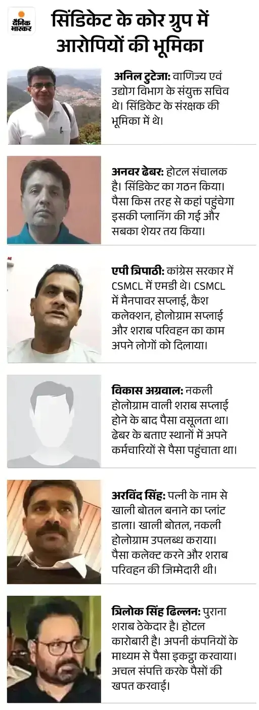 कारोबारी अनवर ढेबर ने सिंडिकेट बनाने के लिए फरवरी 2019 में जेल रोड स्थित होटल वेनिंगटन में प्रदेश के 3 डिस्टलरी मालिकों को बुलाया। इस मीटिंग में छत्तीसगढ़ डिस्टलरी से नवीन केडिया, भाटिया वाइंस प्राइवेट लिमिटेड से भूपेंदर पाल सिंह भाटिया और प्रिंस भाटिया शामिल हुए।