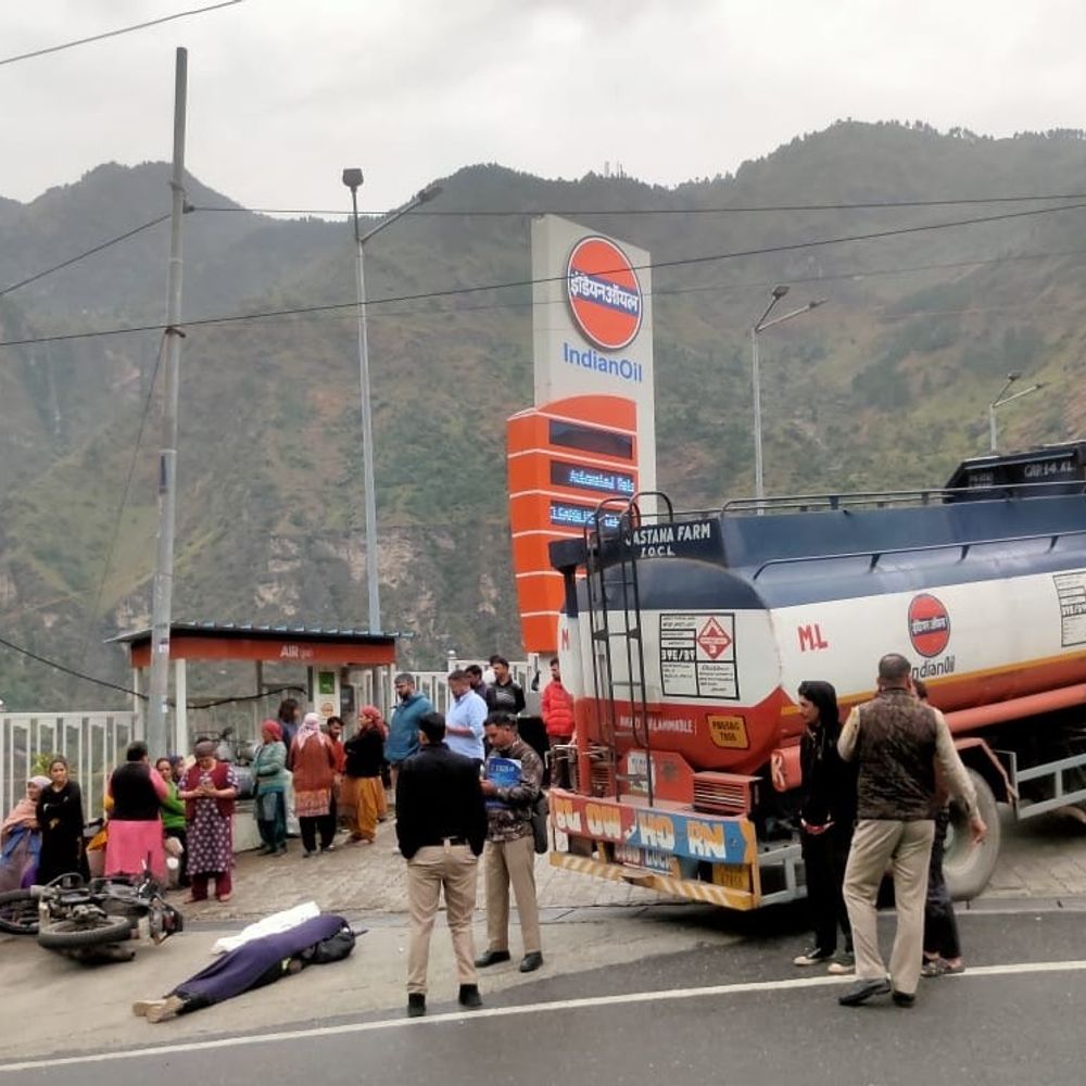 शिमला के रामपुर के ज्यूरी पेट्रोल पंप के पास खड़ा टैंकर जिससे टकराकर महिला की मौत हुई।