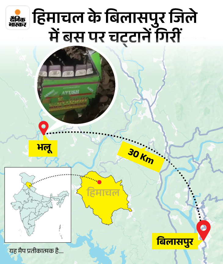 दरअसल, बिलासपुर समेत हिमाचल के ज्यादातर हिस्सों में मंगलवार सुबह से बरसात हो रही है। इसी वजह से शाम 6:25 बजे बरठीं के पास भलू में अचानक पहाड़ का मलबा बस पर आ गिरा। यह बस मरोतन से घुमारवीं जा रही थी।