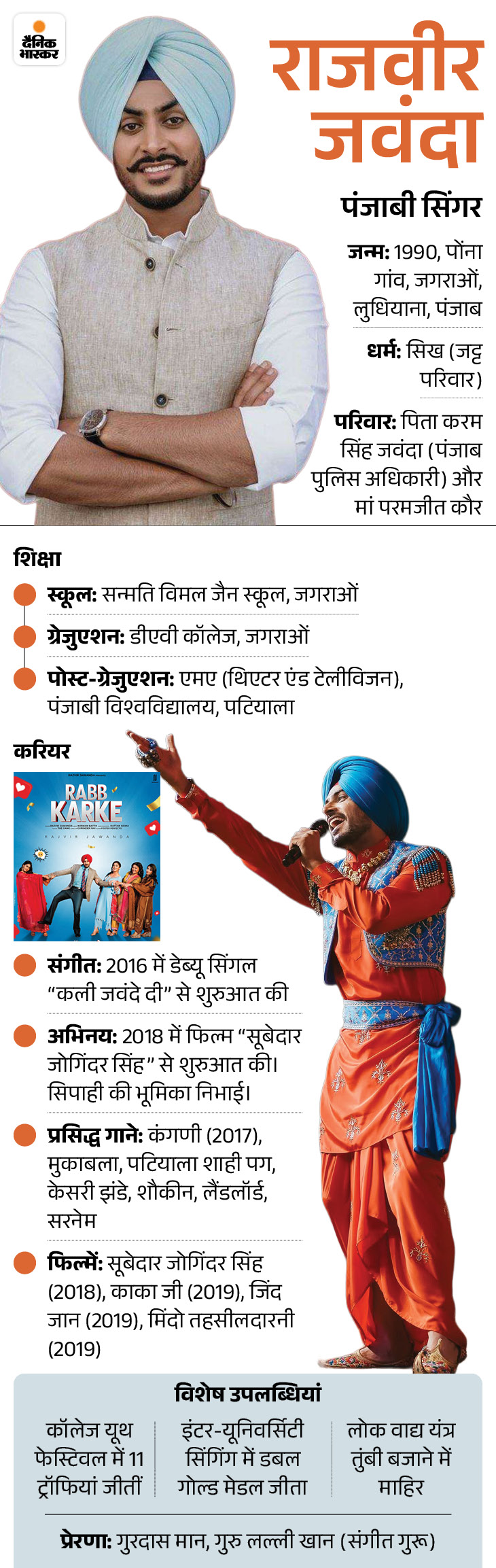 - लुधियाना के पोंना गांव में हुआ जन्म: राजबीर जवंदा एक प्रसिद्ध पंजाबी गायक, अभिनेता, मॉडल और लेखक हैं। वे पंजाबी संगीत उद्योग में अपनी अनोखी गायकी शैली और अभिनय के लिए जाने जाते हैं। उनका जन्म 1990 में पंजाब के लुधियाना जिले के जगराओं तहसील के पोंना गांव में एक सिख जट्ट परिवार में हुआ था।