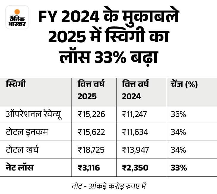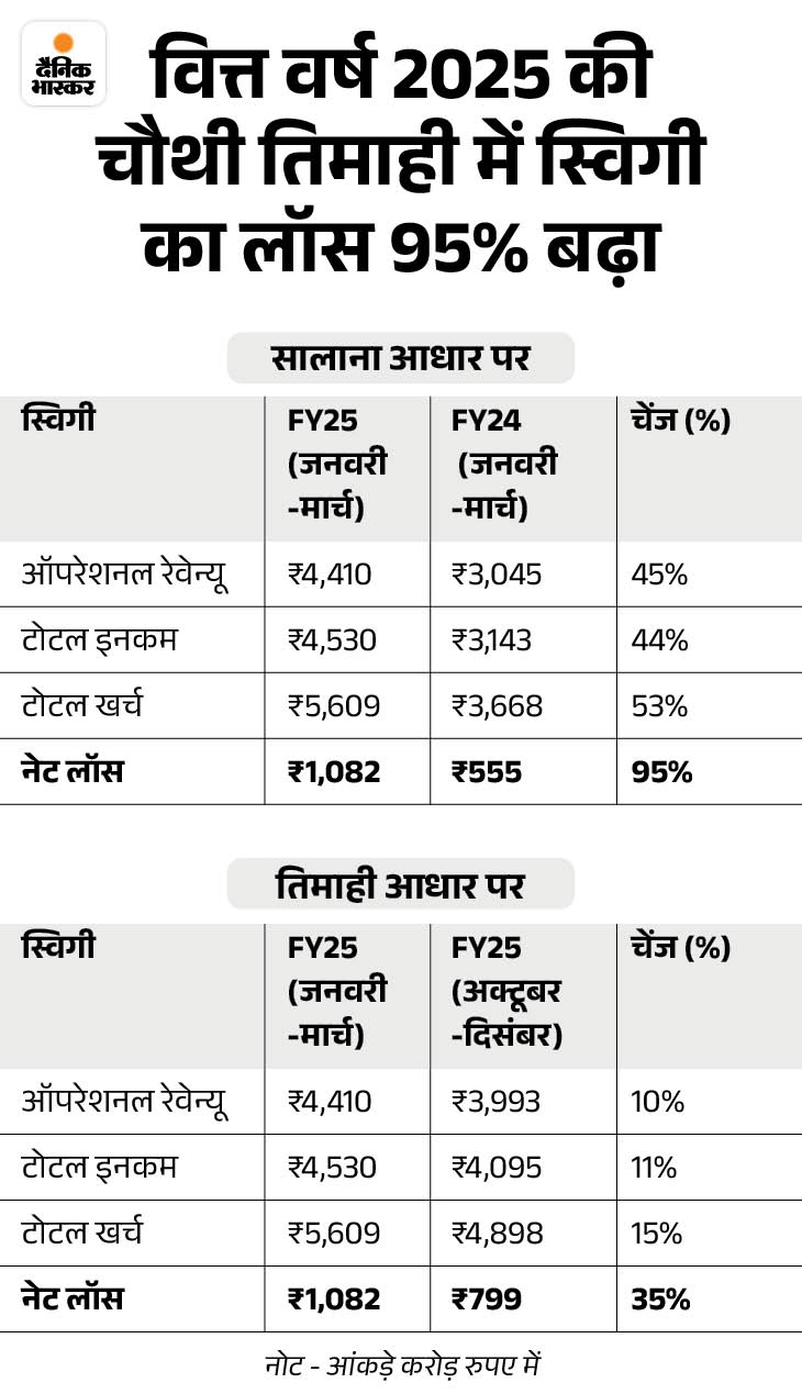 ऑनलाइन फूड डिलीवरी प्लेटफॉर्म स्विगी का जनवरी-मार्च तिमाही में नेट लॉस यानी शुद्ध घाटा सालाना आधार पर 95% यानी लगभग दो गुना बढ़कर ₹1,082 करोड़ रहा। पिछले साल की समान तिमाही में कंपनी को ₹554 करोड़ का घाटा हुआ था।