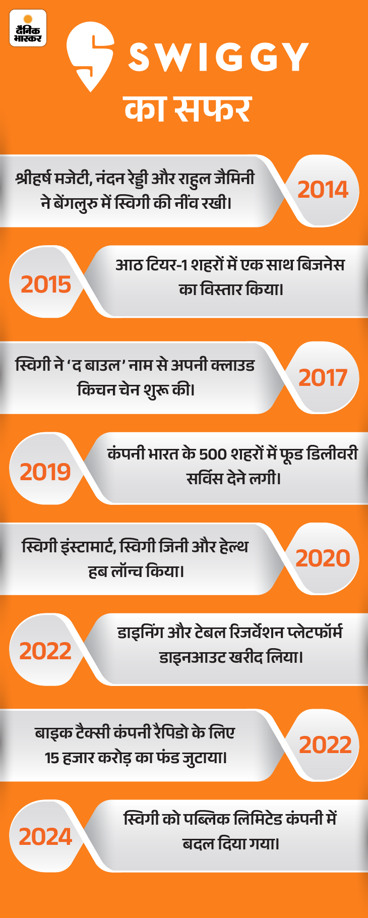 स्विगी की शुरुआत बेंगलुरु के कोरामंगला से हुई थी। फाउंडर्स नंदन रेड्डी और श्रीहर्षा मजेटी ने कुछ डिलीवरी पार्टनर और लगभग 25 रेस्टोरेंट से जुड़कर कंपनी शुरू की। उस वक्त स्विगी ऐप पर मौजूद नहीं था। इसलिए लोग उसकी वेबसाइट पर जाकर अपने मनपसंद रेस्टोरेंट को चुनकर फूड ऑर्डर करते थे।
