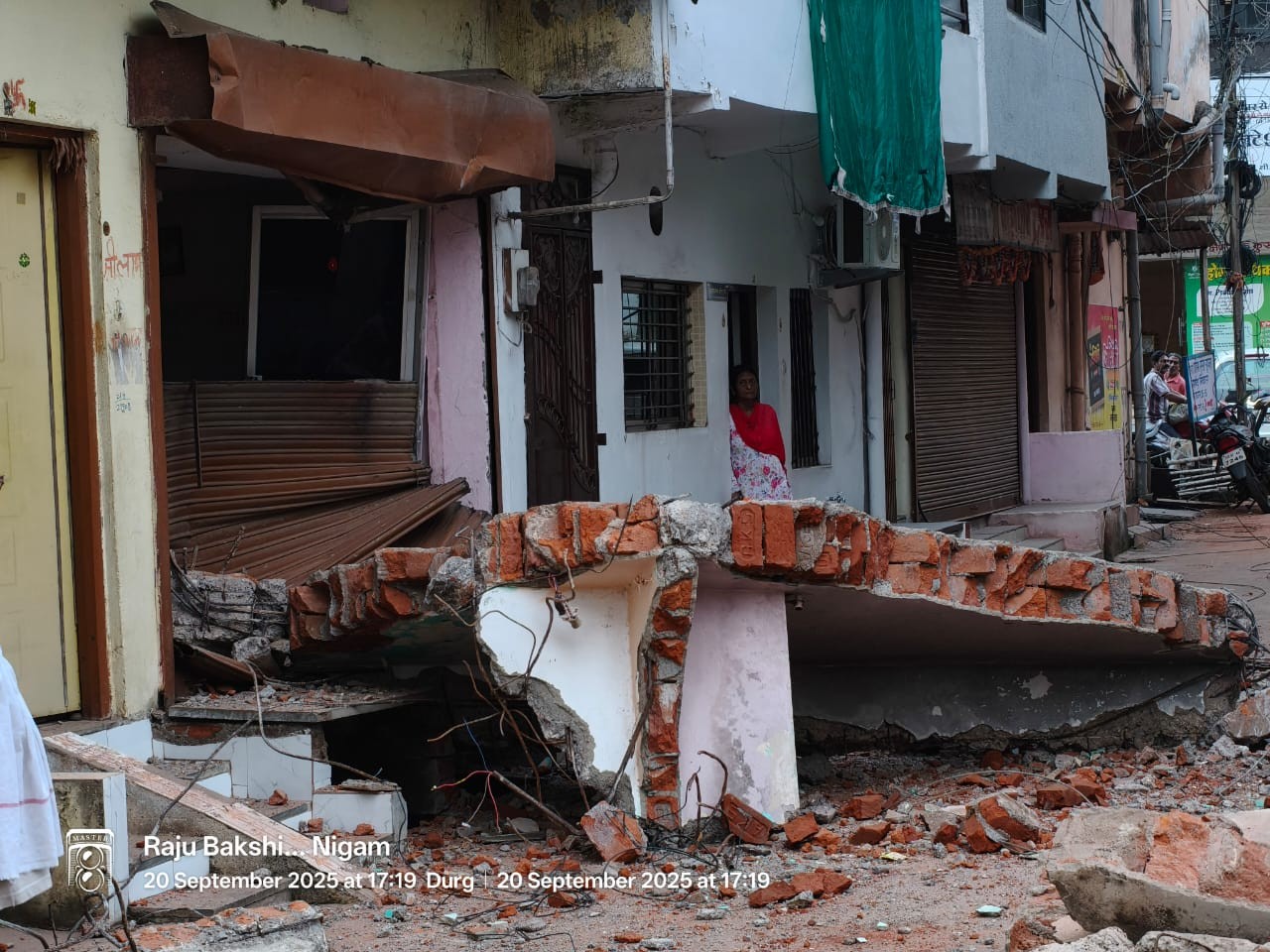 दुर्ग के गंजपारा इलाके में एक चार मंजिला जर्जर मकान को तोड़ने के दौरान शनिवार को दीवार ढह गई। दीवार गिरने से सामने की दुकान को नुकसान पहुंचा। हालांकि इस घटना में कोई जनहानि नहीं हुई।
